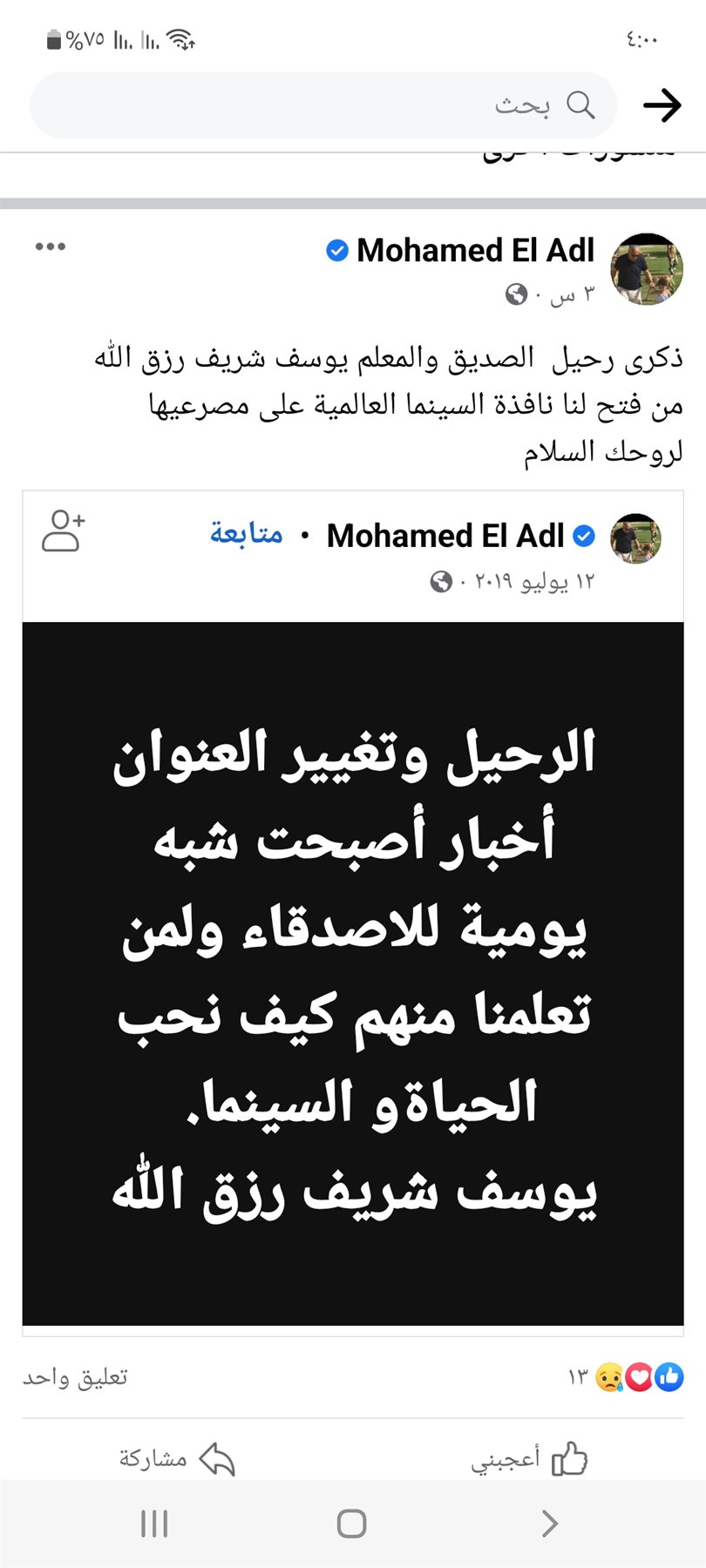 نشر المنتج محمد العدل ، تعليقا عبر صفحته على موقع التواصل الاجتماعى فيسبوك، يحيى فيه ذكرى وفاة الناقد السينمائى الراحل يوسف شريف رزق الله.