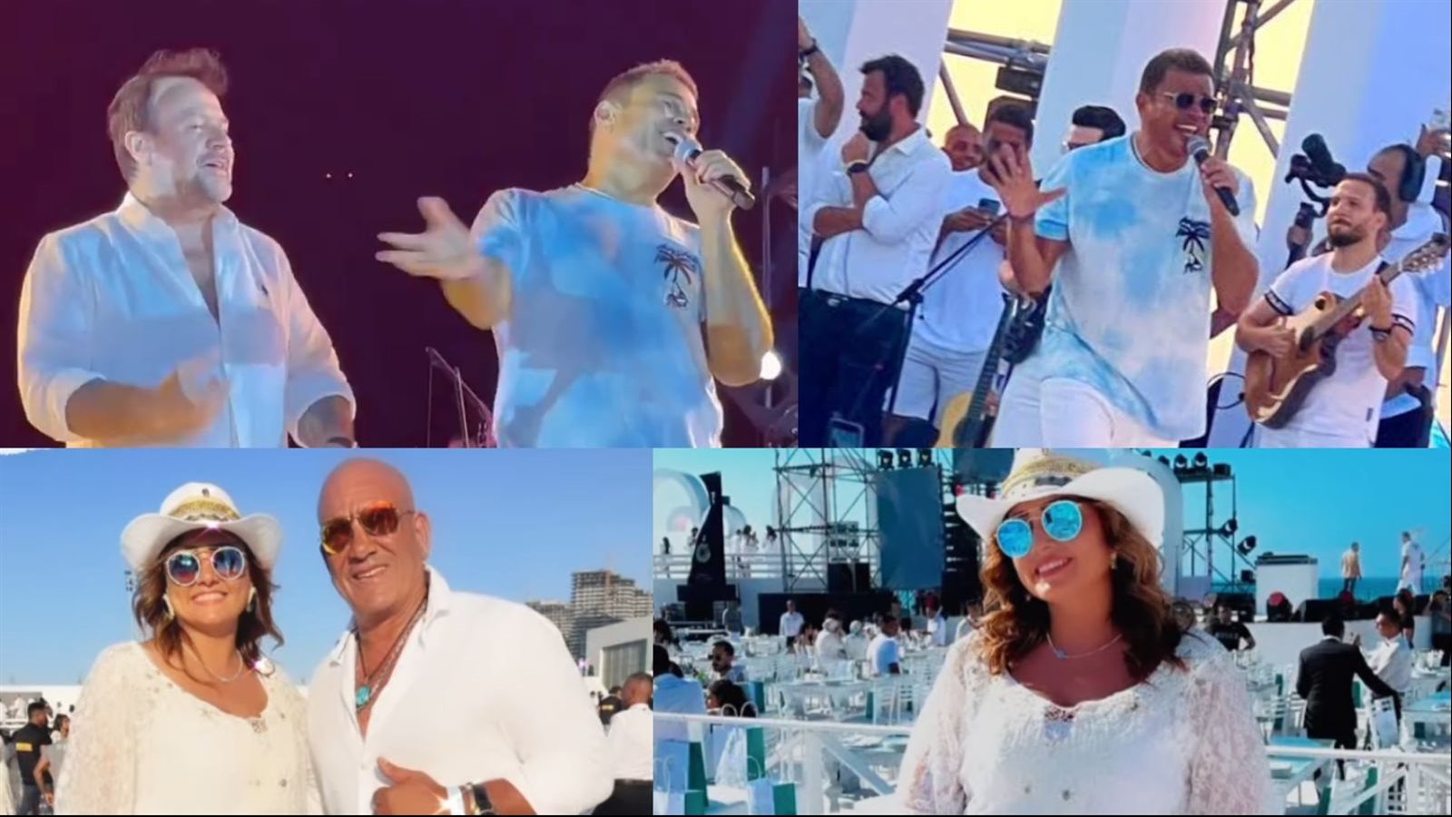 وظهر عمرو دياب في الصور من على خشبة المسرح، وسط عدد كبير من الجمهور، واعتمد عمرو دياب علي طقم كاجوال باللون الأبيض.
