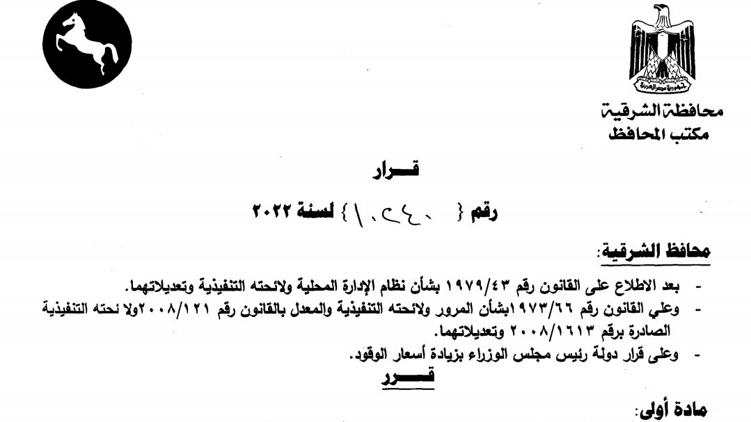 اعتمد الدكتور ممدوح غراب محافظ الشرقية تعريفة الركوب الجديدة لوسائل النقل والمواصلات بمواقف سيارات الأجرة بمختلف مراكز ومدن المحافظة بزيادة تصل إلى 7 % عن تعريفة الركوب السابقة وذلك بعد قرار لجنة التسعير التلقائي للمواد البترولية بتحريك أسعار الوقود.