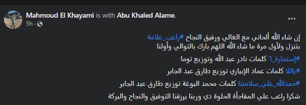 ونشر محمود الخيامي أسماء الأغاني عبر حسابه على موقع فيسبوك، وكتب فيه:" إن شاء الله ألحاني مع الغالي ورفيق النجاح راغب علامة بتنزل ولأول مرة ما شاء الله اللهم بارك بالتوالي وأولنا استمارة ٦ كلمات نادر عبد الله وتوزيع توما".