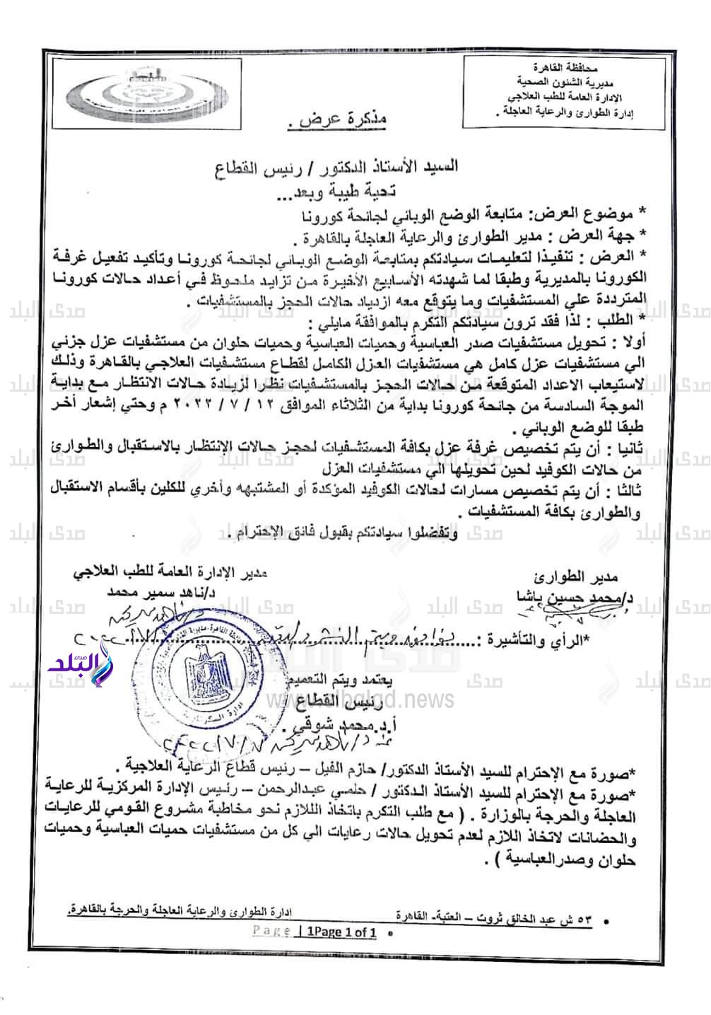 أرسلت مديرية الصحة بمحافظة القاهرة ، مذكرة للعرض علي رئيس قطاع الطب العلاجي بوزارة الصحة والسكان من أجل إعادة فتح 3 مستشفيات عزل بالكامل لمواجهة أي زيادات محتملة من إصابات كورونا .