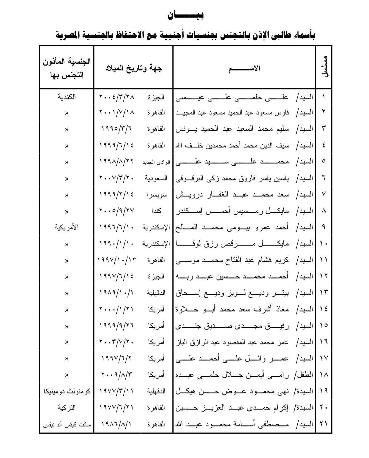 وضمت أسماء طالبى الإذن بالتجنس بجنسيات أجنبية مع الاحتفاظ بالجنسية المصرية كلا من...