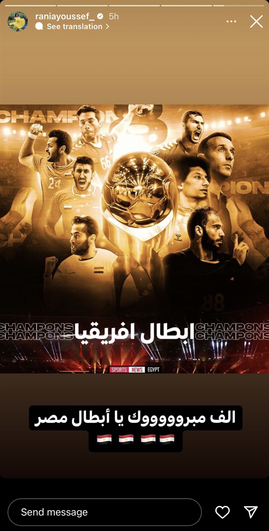 ونشرت رانيا يوسف صورة لمنتخب مصر لرجال كرة اليد، عبر خاصية “الاستوري” بحسابها الشخصي بموقع التواصل الاجتماعي “انستجرام”.