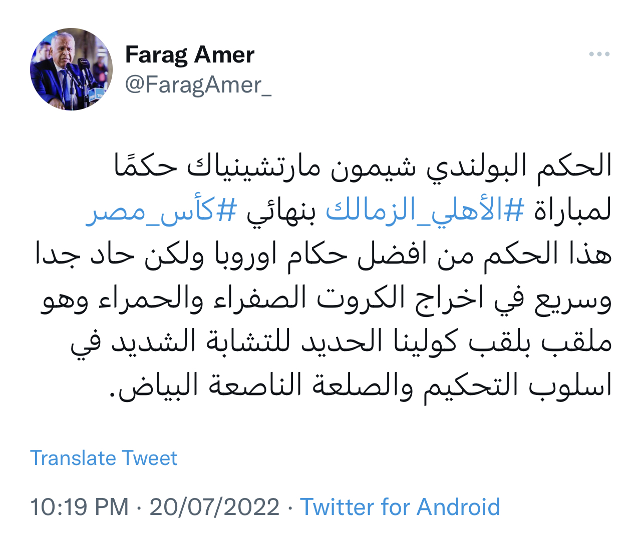 وكتب فرج عامر في تويتة له: “الحكم البولندي شيمون مارتشينياك حكمًا لمباراة #الأهلي_الزمالك بنهائي #كأس_مصر هذا الحكم من افضل حكام اوروبا ولكن حاد جدا وسريع في اخراج الكروت الصفراء والحمراء وهو ملقب بلقب كولينا الحديد للتشابة الشديد في اسلوب التحكيم والصلعة الناصعة البياض”.