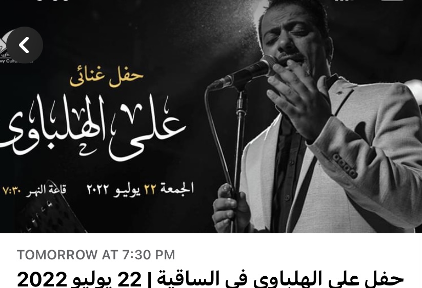 يستعد المطرب على الهلباوي لإحياء حفل غنائي غدا، الجمعة، بقاعة النهر فى ساقية الصاوي فى تمام السابعة ونصف، وتم طرح التذاكر بفئة واحدة بسعر 90 جنيها.