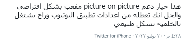 وأوضح رواد مستخدمي موقع التدوينات العالمي "تويتر"، ردا على تغريدات مستخدمي يوتيوب الغاضبين من المشكلة المزعجة، أن لحل هذه المشكلة يمكنهم تعطيل وضع الصورة داخل صورة من إعدادات تطبيق يوتيوب على أجهزة آيفون وسوف يعمل التطبيق بالخلفية بشكل طبيعي.