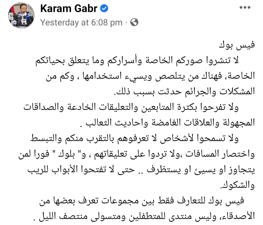 حذر الكاتب الصحفي كرم جبر، رئيس المجلس الأعلى لتنظيم الإعلام، من استخدام موقع التواصل الاجتماعي فيسبوك ، ونشر بوست عبر صفحته الرسمية على موقع التواصل الاجتماعي “فيسبوك”.