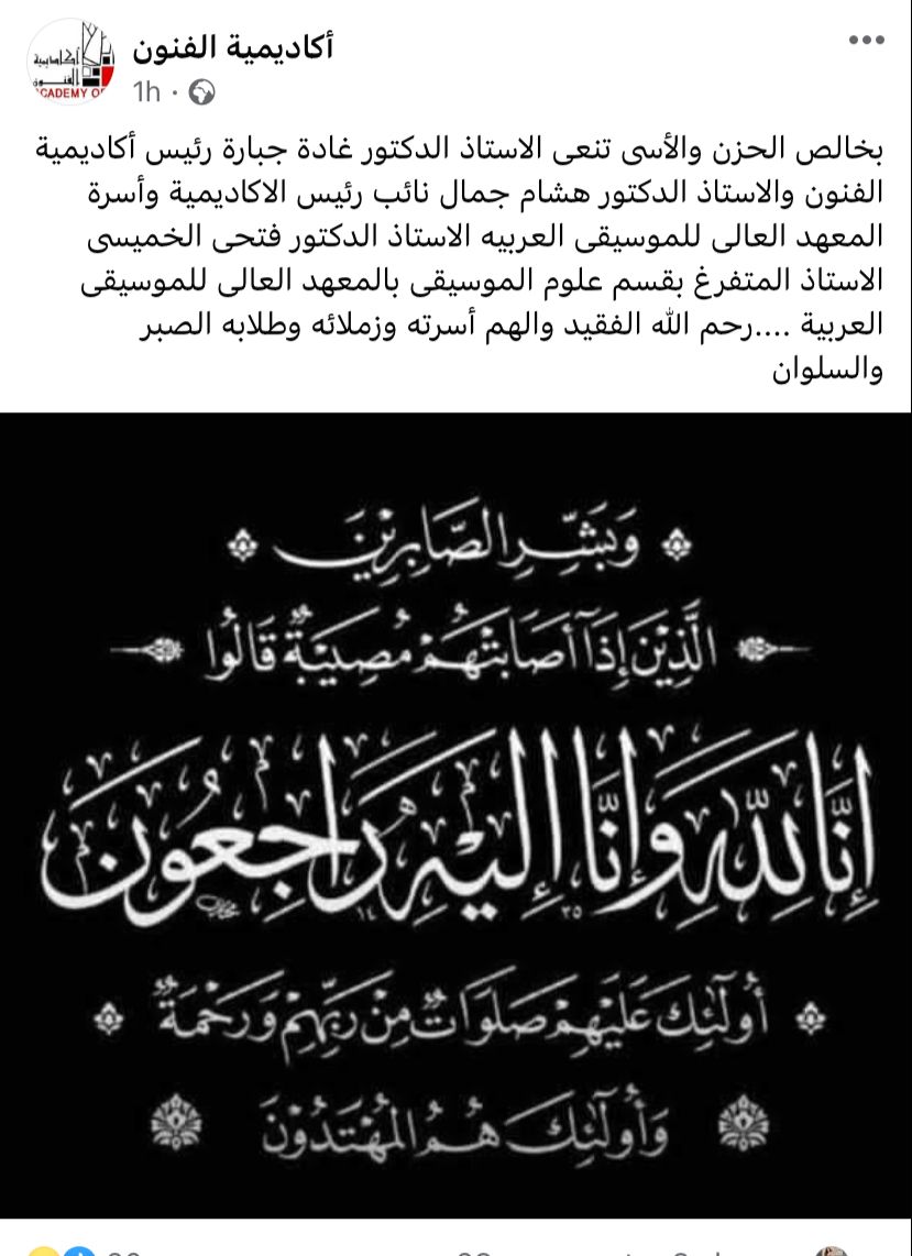 وكتبت الصفحة الرسمية لأكاديمية الفنون: "بخالص الحزن والأسى تنعى الدكتورة غادة جبارة رئيس أكاديمية الفنون والدكتور هشام جمال نائب رئيس الاكاديمية وأسرة المعهد العالى للموسيقى العربية، الدكتور فتحى الخميسى الأستاذ المتفرغ بقسم علوم الموسيقى بالمعهد العالى للموسيقى العربية ....رحم الله الفقيد والهم أسرته وزملائه وطلابه الصبر والسلوان".