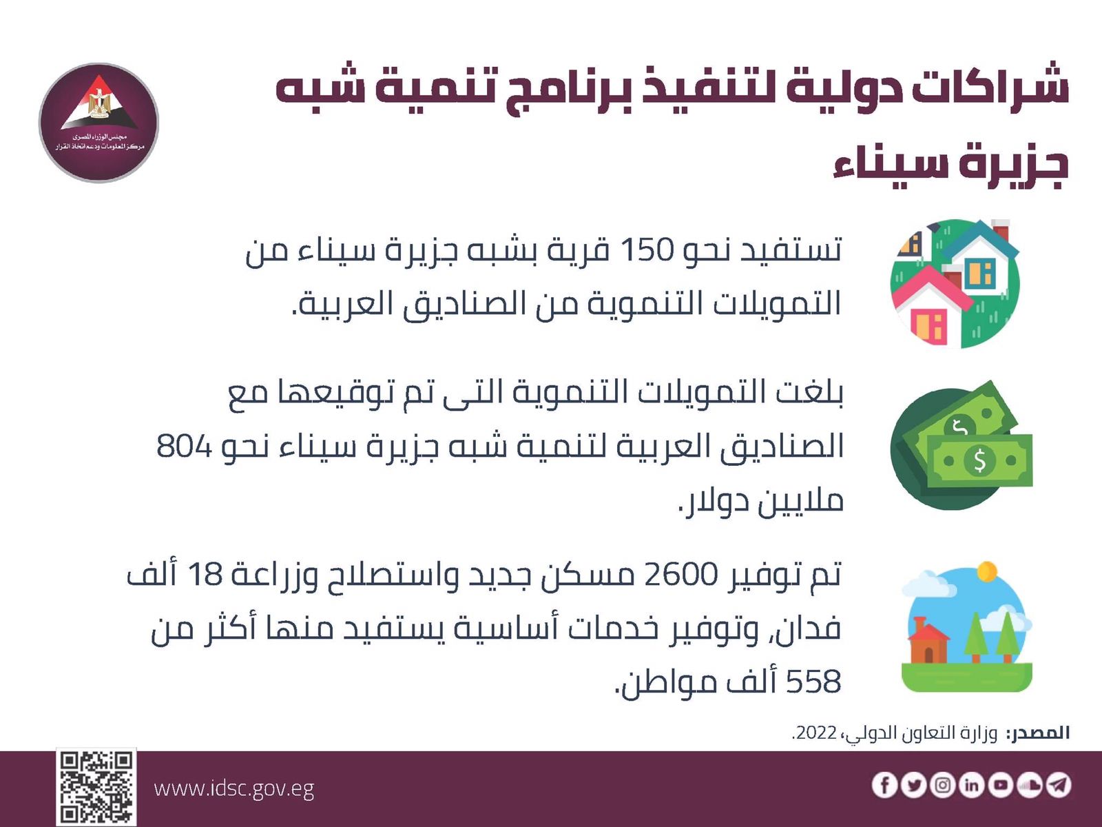 وأوضح الانفوجراف انه في ضوء الجهود المبذولة لتحقيق التنمية المستدامة في شبه جزيرة سيناء، استفادت 150 قرية في شبه جزيرة سيناء من التمويلات التنموية من الصناديق العربية.