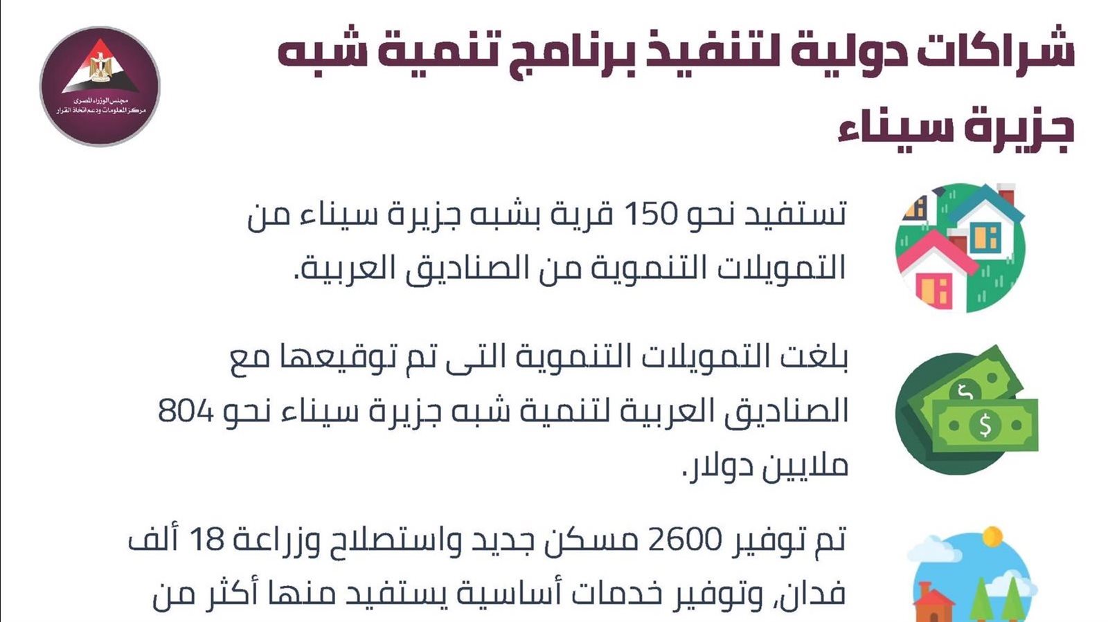 نشر مركز المعلومات ودعم اتخاذ القرار بمجلس الوزراء انفوجراف عبر صفحته الرسمية على موقع التواصل الاجتماع فيس بوك حول الجهود المبذولة لتحقيق التنمية المستدامة في شبه جزيرة سيناء.