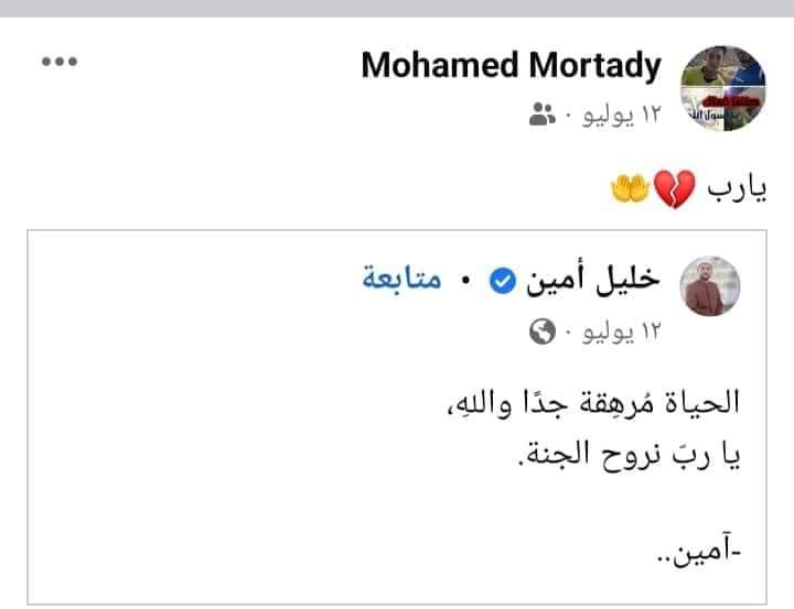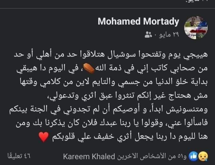فيما كانت آخر كلمات الشاب الغريق علي موقع التواصل الاجتماعي الفيس بوك كأنه كان يتنبا بوفاته "هيجي يوم وتفتحوا سوشيال هتلاقوا حد من أهلي أو حد من صحابي كاتب إني في ذمة الله فى اليوم ده هيبقي بداية خلو الدنيا من جسمي والتايم لاين من كلامي وقتها مش محتاج غير إنكم تنثروا عبق أثري وتدعولي، ومتنسونيش أبدا وأوصيكم إن لم تجدوني في الجنة بينكم فاسألوا عني وقولوا يا ربنا عبدك فلان كان يذكرنا بك ومن هنا لليوم ده ربنا يجعل أثري خفيف على قلوبكم".
