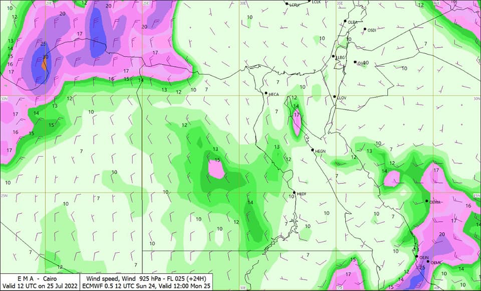وعن حالة البحرين المتوسط والأحمر، يكون المتوسط معتدل وارتفاع الموج فيه يتراوح ما بين 1.25 لـ 1.75 متر، واتجاه الرياح شمالية غربية، أما البحر الأحمر يكون خفيف إلى معتدل وارتفاع الموج يتراوح ما بين 1 لـ 1.5 متر واتجاه الرياح جنوبية شرقية إلى جنوبية غربية.