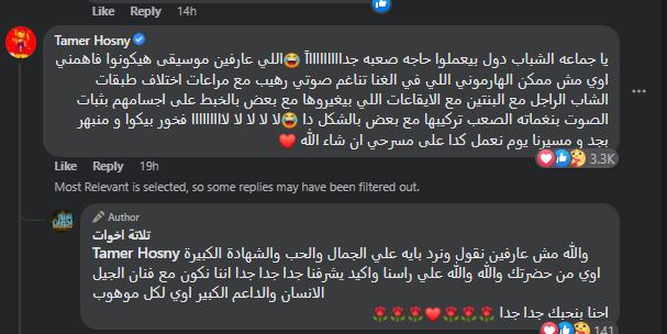 وعقب حساب فريقة ثلاثة أخوات على إشادة تامر حسني قائلا:" والله مش عارفين نقول ونرد بايه علي الجمال والحب والشهادة الكبيرة اوي من حضرتك والله والله علي راسنا واكيد يشرفنا جدا جدا جدا اننا نكون مع فنان الجيل الانسان والداعم الكبير اوي لكل موهوب".