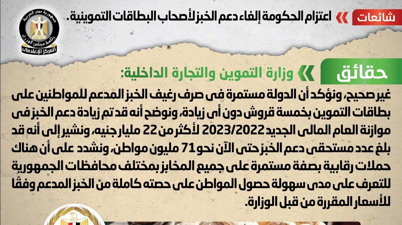 أثارت شائعات الغاء دعم الخبز لأصحاب البطاقات التموينية الجدل خلال الآونة الأخيرة مما دفع الحكومة على الفور إلى إصدار بيان بنفي شائعة اعتزامها إلغاء الدعم عن رغيف الخبز حيث قامت بتكذيبه بعد التواصل مع وزارة التموين والتجارة الداخلية من خلال الصفحة الرسمية للمركز على فيس بوك.