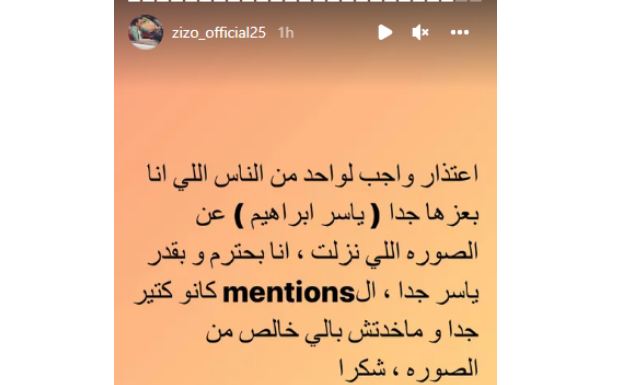 وعلى الفور كتب أحمد سيد زيزو عبر خاصية الـ ستوري مجددًا بعد حذف الصورة: "اعتذار واجب لواحد من الناس اللي انا بعزها جدا (ياسر ابراهيم) عن الصورة اللي نزلت، انا بحترم وبقدر ياسر جدا، الـ mentions كانو كتير جدا وما خدتش بالي خالص من الصورة، شكرا".