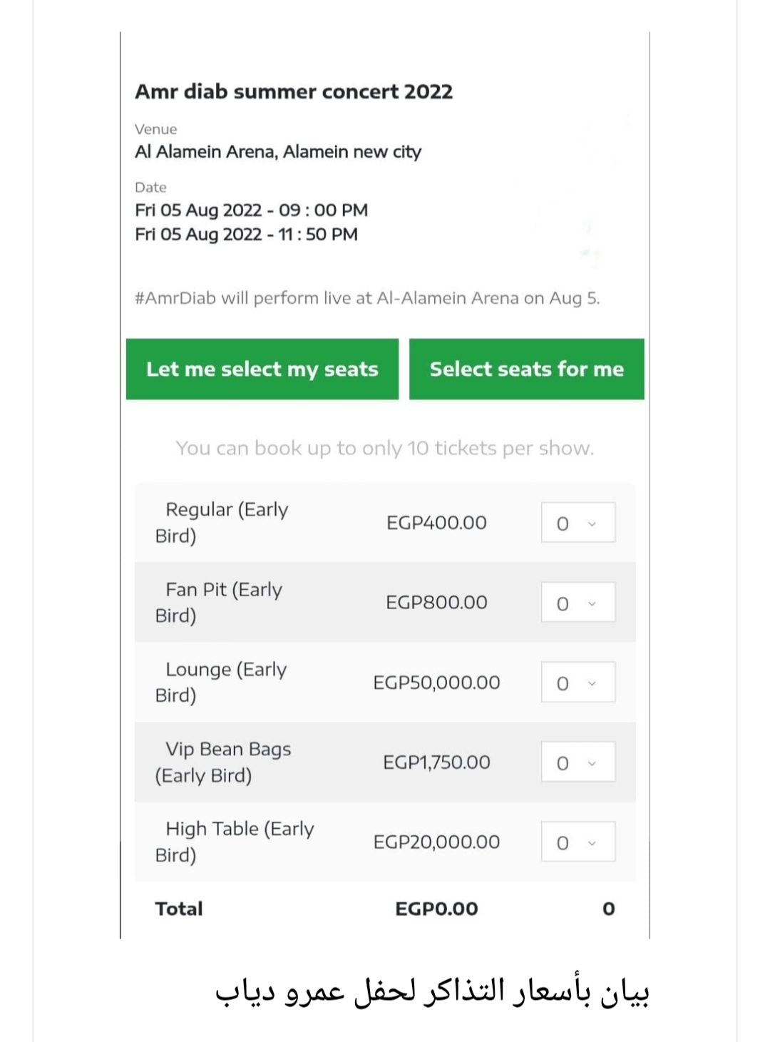 وتنوعت فئات أسعار تذاكر حفل عمرو دياب بين 5 فئات، الأولى Regular بـ 400 جنيه، والثانية Fan Pit بـ 800 جنيه، والثالثة Loung بـ 50 ألف جنيه، والرابعة VIP Bean Bags بـ 1750 جنيه، والخامسة والأخيرة High Table بـ 20 ألف جنيه.