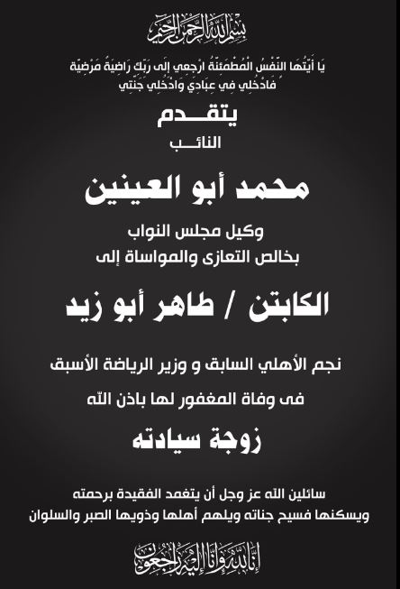 تقدم النائب محمد أبو العينين وكيل مجلس النواب، بخالص العزاء وصادق المواساة، للكابتن/ طاهر أبو زيد وزير الرياضة الأسبق والنجم التاريخي لمنتخب مصر لكرة القدم والنادي الأهلي، في وفاة المغفور لها بإذن الله السيدة الفاضلة قرينة سيادته.