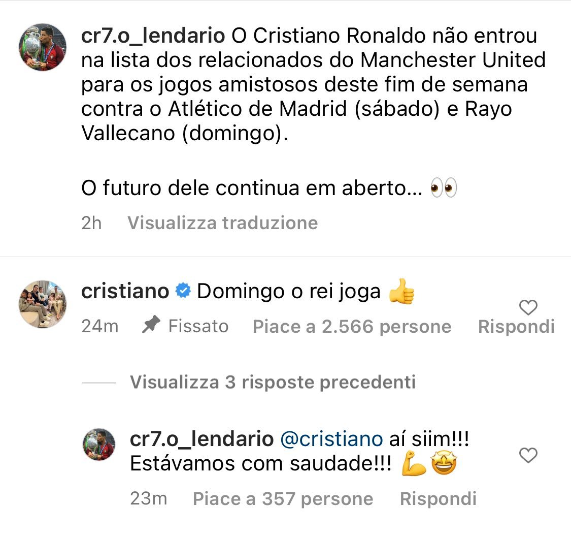 وأعلن رونالدو عبر تعليق له عبر إنستجرام رداً على أحد المشجعين أنه سيعود لمانشستر يونايتد وسيشارك مع كتيبة تين هاج في المباراة الودية أمام رايو فاليكانو يوم الأحد المقبل.