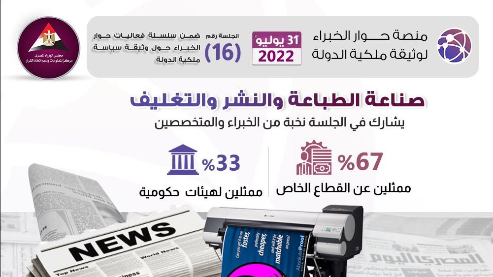 يعقد مركز المعلومات ودعم اتخاذ القرار بمجلس الوزراء، ورشة عمل، غدًا الأحد، في إطار سلسلة جلسات “حوار الخبراء”؛ لمناقشة مستهدفات وثيقة “سياسة ملكية الدولة بقطاع صناعة الطباعة والنشر والتغليف”.