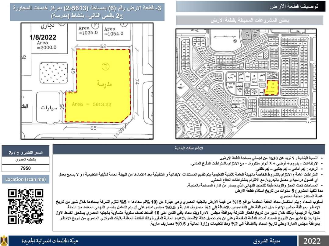 أعلن جهاز تنمية مدينة الشروق، عن طرح قطعة أرض مخصصة لإنشاء مدرسة للبيع بنظام التخصيص الفورى ، بمساحة 5613م بمركز خدمات المجاورة الثانية بالحى الثانى، على أن يكون سعر المتر 7950 جنيها، بإجمالى 44 مليون و623 ألفاً.