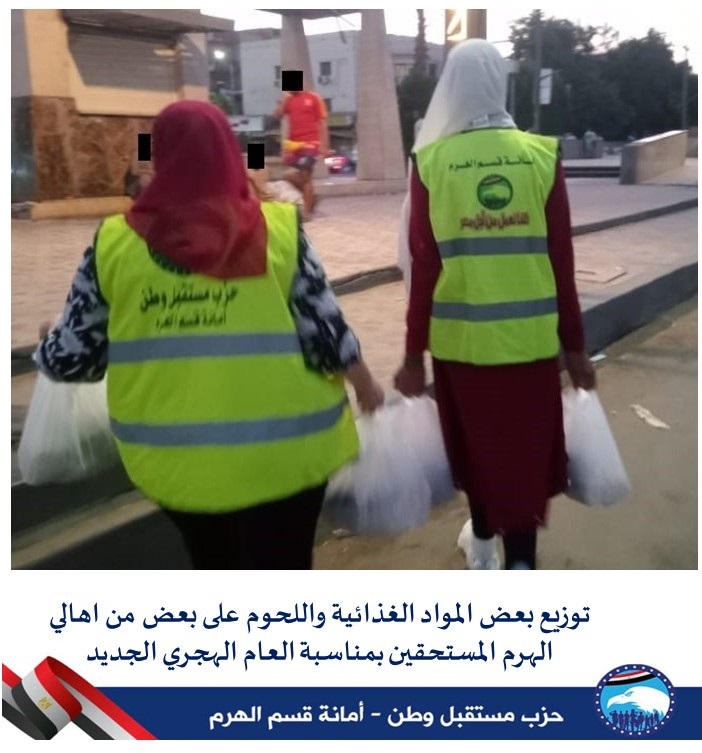 وزعت أمانة قسم الهرم، عدداً من المواد الغذائية واللحوم علي المواطنين الأكثر احتياجاً، بمناسبة العام الهجري الجديد، وتم تشكيل فرق من شباب الأمانة لتوزيع المساعدات، وفقاً لكشوف المستحقين من الأسر الأولي، ومن جانبه، قام وفداً من الأمانة بزيارة لمقر التأمين الصحي للوقوف علي متطلبات الأهالي وتيسير سبل الدعم والمساندة، وعلي جانب أخر، واصلت أمانة قسم إمبابة الدورة المجانية لتعليم اللغة الإنجليزية، التي ينظمها أمانتي التعليم والبحث العلمي والمرأة، والتي يحاضر فيها نخبة من معلمي اللغة، وفي سياق أخر، نظمت أمانة مدينة ومركز منشأة القناطر، قافلة طبية للكشف الطبي عن أمراض العيون بالمجان، وفي أمانة قسم الطالبية، افتتحت وحدة حزبية جديدة لخدمة المواطنين.