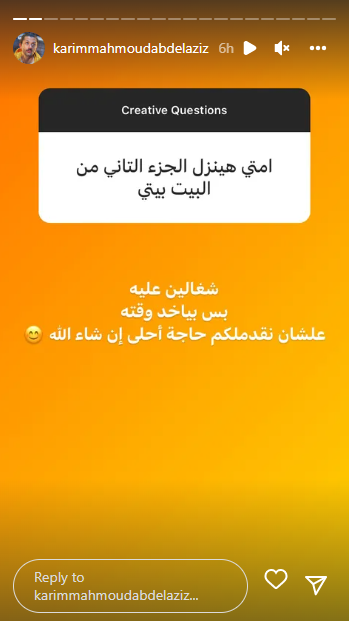 وبالسؤال عن موعد صدور الجزء الثاني من مسلسل “البيت بيتي”، قال كريم محمود عبد العزيز أنهم ما زالوا يعملون على تصويره، وعلق كاتبًا: “بياخد وقته علشان نقدملكم حاجة أحلي إن شاء الله”.