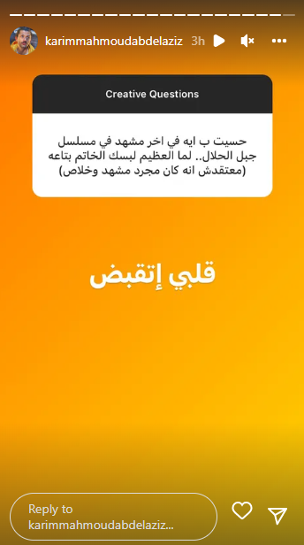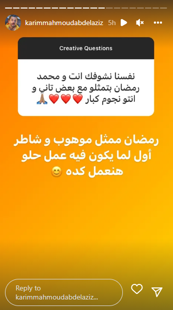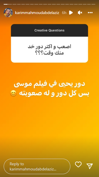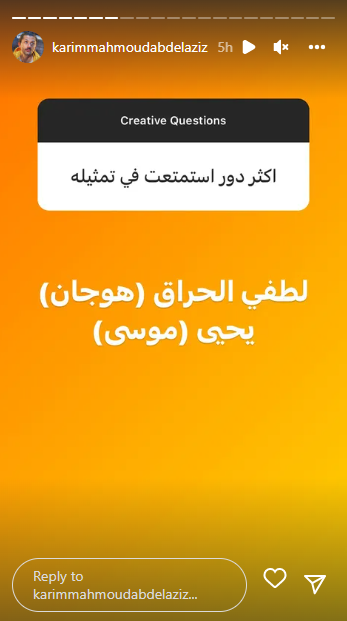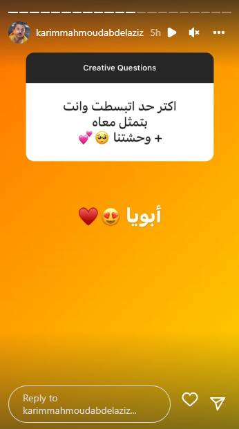 وترك الفنان كريم محمود عبد العزيز المجال للمتابعين، من خلال فقرة الأسئلة والإجابة عبر خاصية “الاستوري”، والذي سأل فيها عدد من المتابعين عن أعماله الجديدة، وأكثر الأعمال التي يحبها في مجال تمثيله، مع بعض الأسئلة المختلفة الأخري.