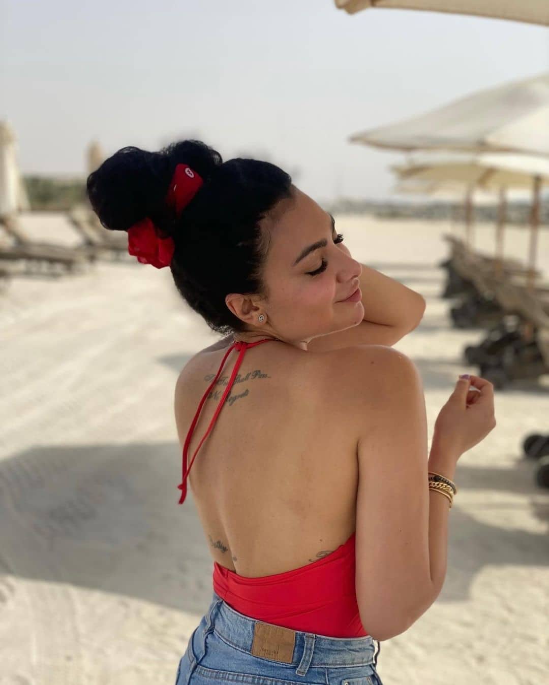 وأيضا من النجمات اللاتى يحرصن على اظهار كل ما هو جديد سواء فى اللوك التى تظهر به أو رسم التاتوهات الفنانة ميريهان حسين التى ظهرت فى أحدث صورها بأكثر من تاتوه الأول على ظهرها وأخر فى منطقة الرجل.