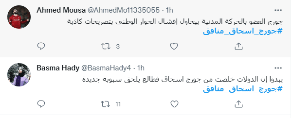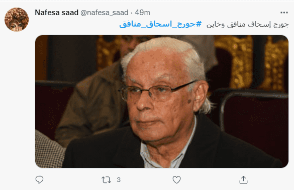 ودشن رواد السوشيال ميديا هاشتاج “ جورج إسحاق منافق ” وتصدر قائمة الاعلى تداولا على تويتر وجاءت أبرز التغريدات كالآتي :