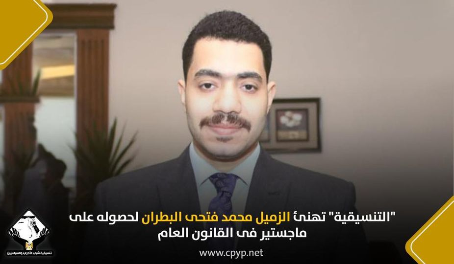 تهنئ تنسيقية شباب الأحزاب والسياسيين، الزميل محمد فتحى البطران، بمناسبة حصوله على ماجستير فى القانون العام من جامعة بنها.