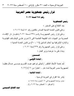 قرارً رقم 354 بمد خدمة الدكتور شوقي علام مفتيا الجمهورية لمدة عام.