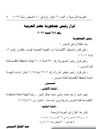 قرارً رقم 356 بتعيين وليد محمد سامى جمال الدين رئيسا للهيئة العامة للمنطقة الاقتصادية لقناة السويس بدرجة وزير لمدة عام