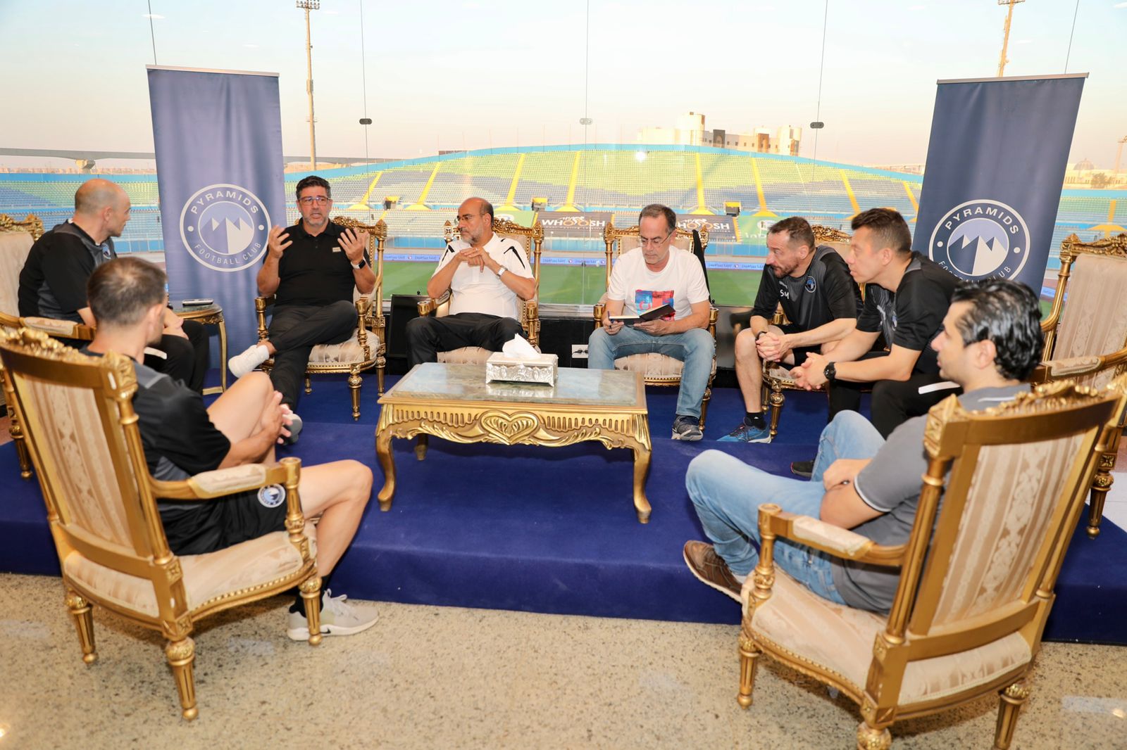 وحرص اليوناني تاكيس جونياس المدير الفني لنادي بيراميدز، وأحمد زاهر المدير الإداري، على أن يكونا في استقبال روي فيتوريا مدرب المنتخب الذي حضر بصحبة جهازه المعاون، وبحضور عامر حسين عضو مجلس إدارة اتحاد الكرة ورابطة الأندية المحترفة، في ملعب الدفاع الجوي.