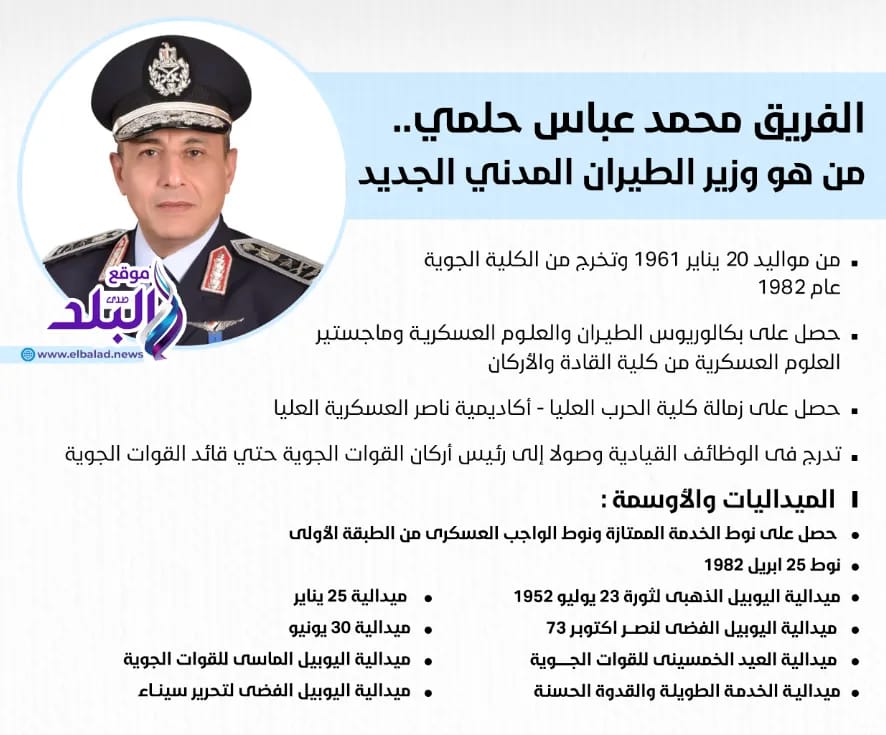 الفريق محمد عباس حلمي وزير الطيران الجديد، الذي جاء ضمن التعديل الوزاري الجديد، هو من مواليد 20 يناير 1961، وتخرج من الكلية الجوية عام 1982.