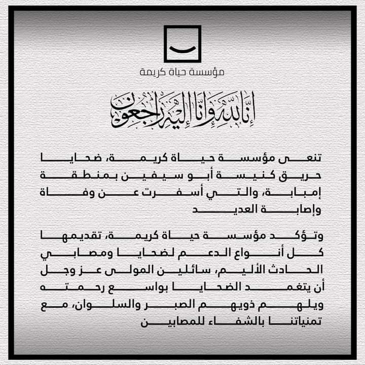 تقدم اتحاد نقابات المهن الطبية، بخالص التعازى في ضحايا حادث حريق كنيسة أبي سيفين بمنطقة مطار إمبابة، داعيا الله أن يمن على المصابين بالشفاء العاجل، وأن يلهم أُسر الضحايا وذويهم الصبر والسلوان، وأن يحفظ مصر وشعبها من أى مكروه أو سوء.