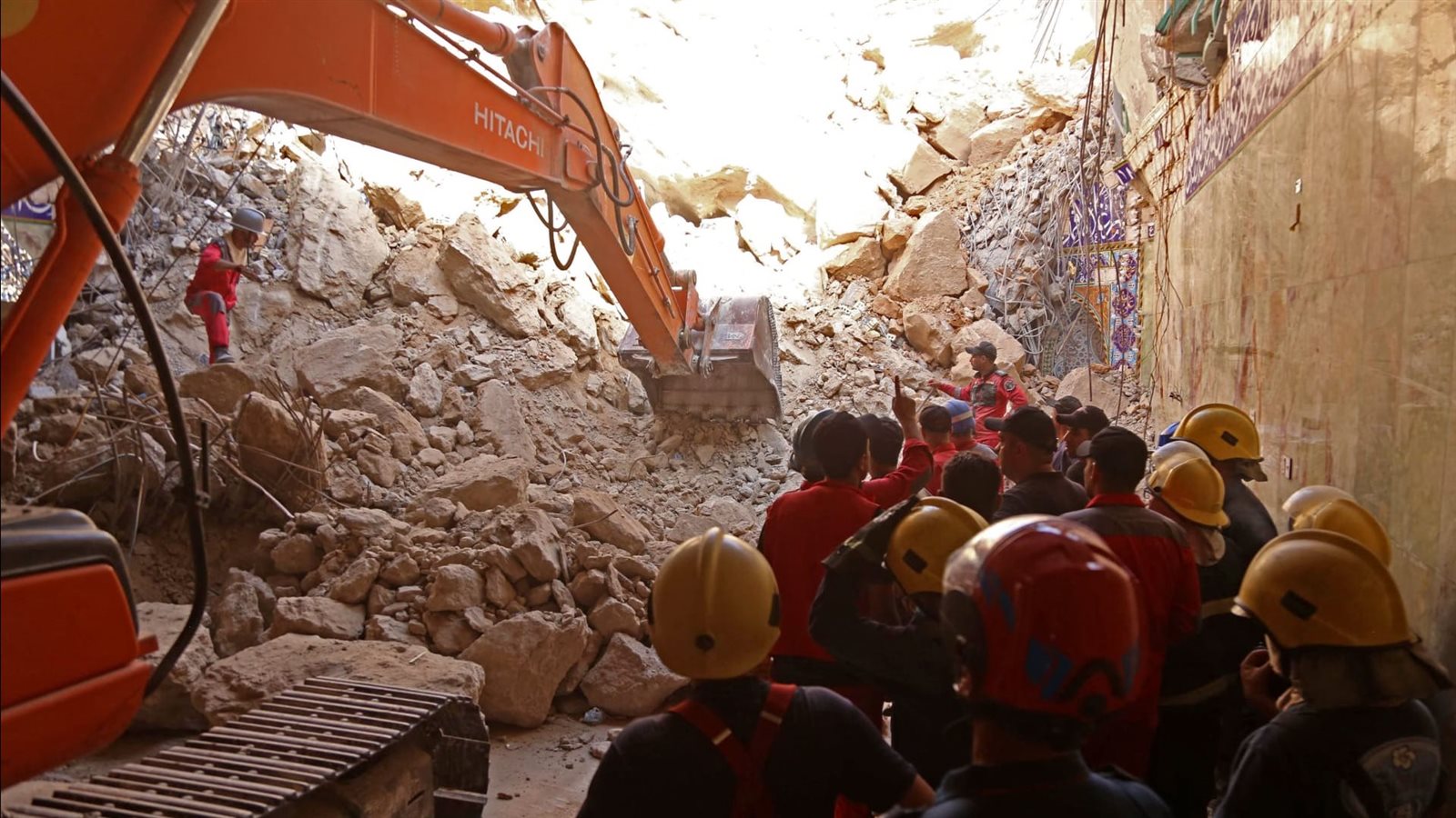 وحتى مساء الأحد، كانت فرق الدفاع المدني تواصل محاولتها الحفر بالجرارات والمعدات اليدوية لانتشال الأشخاص، الذين لايزالون عالقين في قطارة الإمام علي.