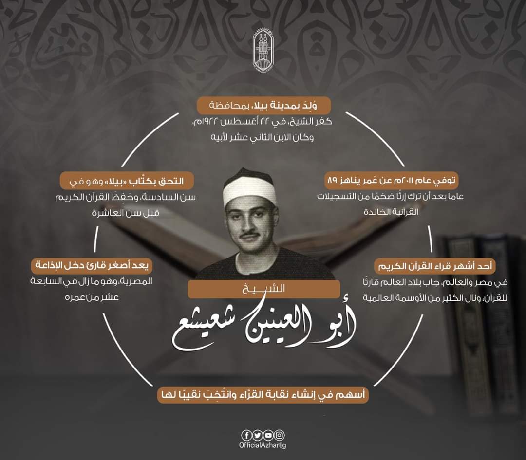 احتفت الصفحة الرسمية للأزهر بمائة عام على مولد الشيخ أبو العينين شعيشع، أحد أعلام مدرسة التلاوة وذلك من خلال صفحة التواصل الاجتماعي فيس بوك .