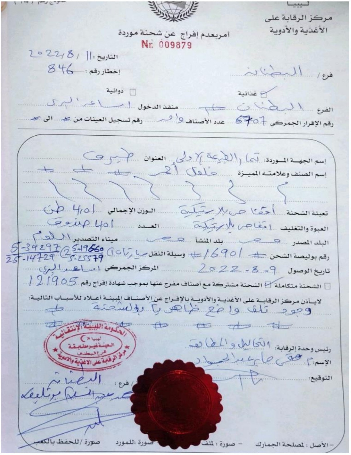 وقال المركز الليبي، إنه “تم رفض الشحنة نظرا لاحتواء الشحنة على تعفن ورائحة، كما أنها مفتقدة للخواص الطبيعية”.