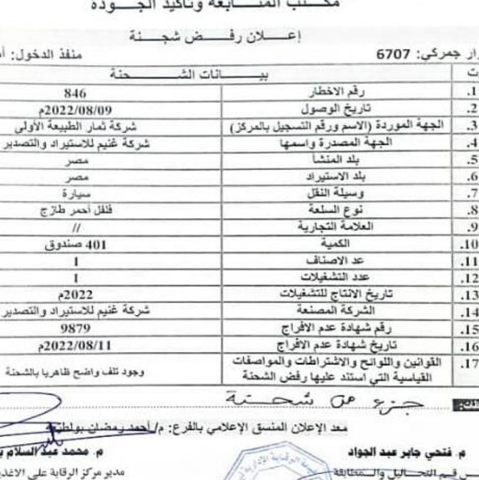 أعلن مركز الرقابة على الأغذية والأدوية في ليبيا، اليوم الإثنين، رفضه شحنة فلفل أحمر مصري.