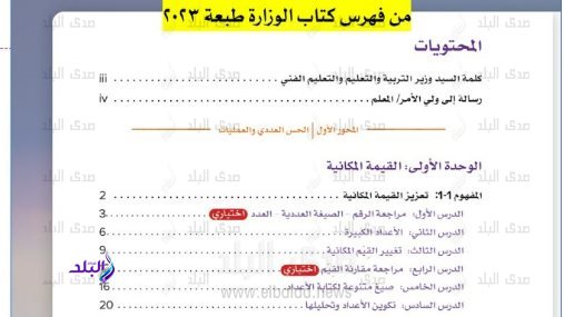 ونشرت مؤسسة الكتب الخارجية الشهيرة صورا اكدت انها من فهرس كتاب الوزارة طبعة 2023 موضحا به ظهور كلمة اختياري بجوار عددا من الدروس المقررة في مادة الرياضيات المقررة على الصف الرابع الابتدائي 2023