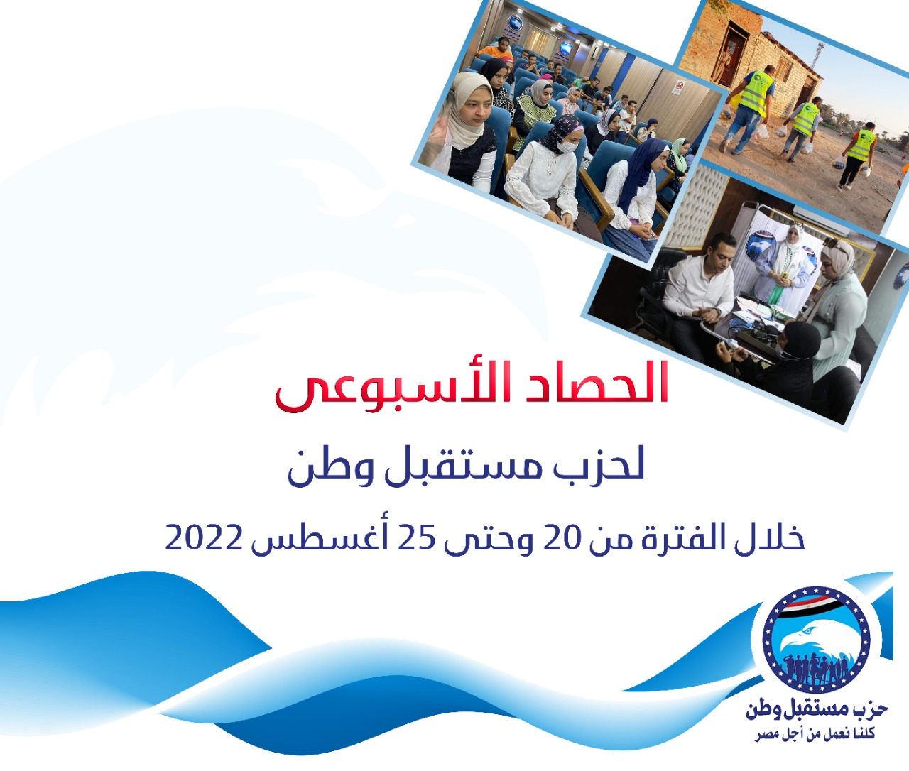شهد الأسبوع المنقضى، نشاطاً مكثفاً ومتنوعاً، لحزب مستقبل وطن، حيث نظم عدداً كبيراً من الأنشطة والفعاليات الخدمية للأعضاء والمواطنين، في محافظات الجمهورية، وذلك ضمن إطار خطة الحزب لمشاركة الدولة في تقديم وسائل العون للمواطن ومحاربة الغلاء، وأيضا في إطار حملات الحزب المستمرة للتواصل مع الشارع المصري والمواطنين، وإيماناً منه بدوره المهم والفعال بضرورة التواجد والتلاحم مع المواطنين.