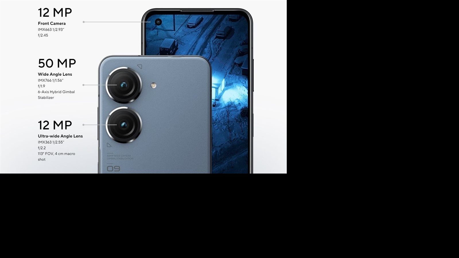 يدعم الهاتف تصوير فوتوغرافي عالي الدقة، فيقدم هاتف Asus Zenfone 9 كاميرا خلفية مزدوجة ، تأتي الرئيسية بدقة 50 ميجابكسل بفتحة عدسة F/1.9 بوصة، وكاميرا أخرى بزاوية عريضة دقة 12 ميجابكسل، بجانب كاميرا أمامية لالتقاط صور السيلفي ومكالمات الفيديو بدقة 12 ميجابكسل.