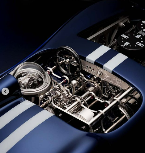 ويشتمل تصميم ساعة الطاولة التي تشبه السيارة ذات المقعدين على حركتين مستقلتين تقودهما مصادر طاقة منفصلة ، فالحركة الأولى مسؤولة عن انتظام حركة الساعات والدقائق الموجودة في قمرة القيادة ، ويتم عرضها باستخدام أقراص دوارة من الفولاذ المقاوم للصدأ مع فلاتر الهواء التي تغذي مصارف المكربن المزدوجة أعلى المحرك.