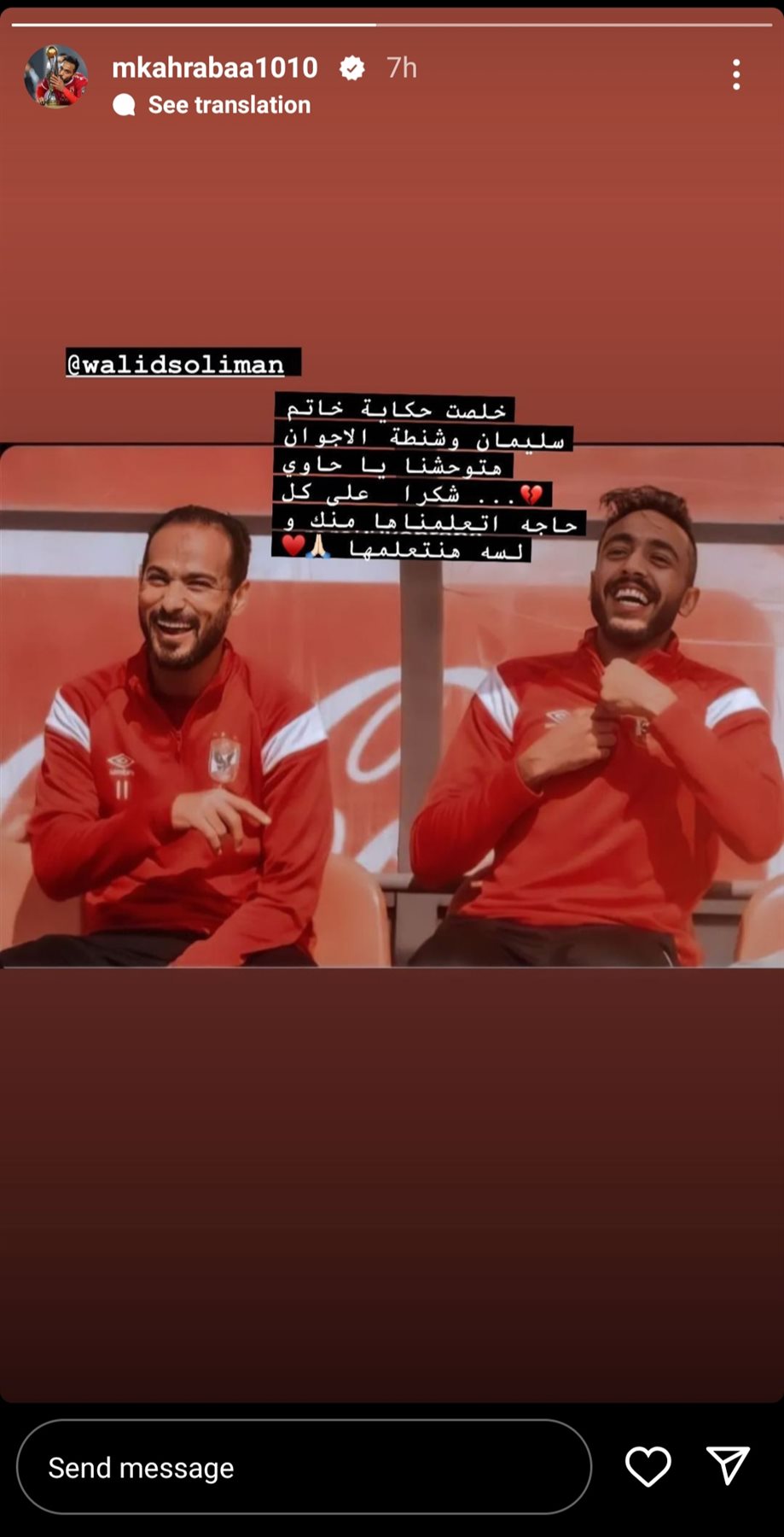 شارك اللاعب كهربا، رسالة للاعب وليد سليمان بعد إعلان الاعتزال نهاية الموسم الحالي، عبر حسابه الشخصي على موقع التواصل الاجتماعي انستجرام.