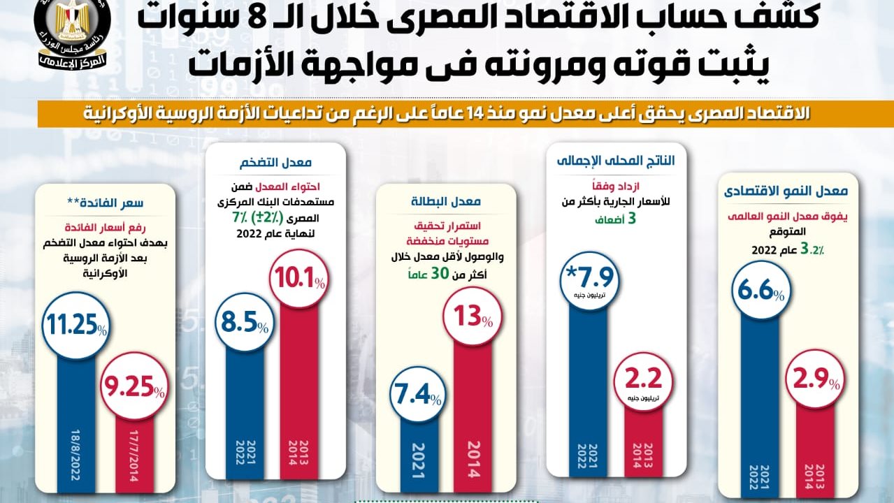 وأيضاً، فقد تعافى صافي الاستثمار الأجنبي المباشر بشكل ملحوظ برغم الأزمات المتوالية ليسجل 7.3 مليار دولار (بيان مبدئي) في (يوليو- مارس) 2021/2022، مقارنة بـ 3.1 مليار دولار في (يوليو- مارس) 2013/2014.