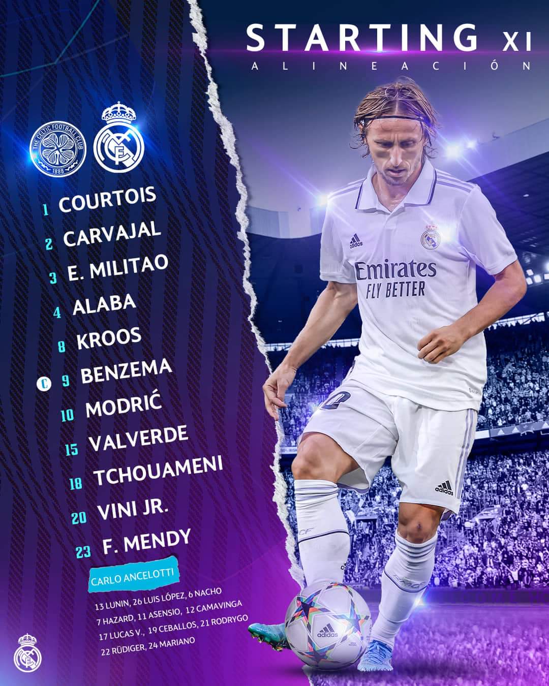 أعلن كارلو أنشيلوتي المدير الفني لريال مدريد تشكيل فريقه لمواجهة سيلتيك في أولى جولات دوري أبطال أوروبا.