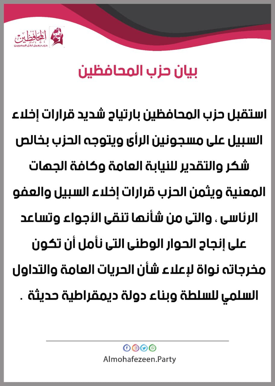 استقبل حزب المحافظين، بارتياح شديد، قرارات إخلاء سبيل مسجوني الرأي، متوجها بخالص الشكر والتقدير، إلى النيابة العامة، وكل الجهات المعنية.