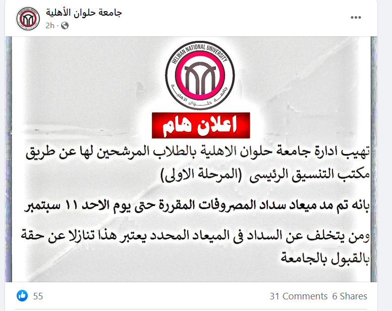 جدير بالذكر أنه في حالة التخلف عن سداد مصروفات جامعة حلوان الاهلية في الميعاد المحدد ، سيعتبر ذلك تنازلا عن حق الطالب في القبول في جامعة حلوان الاهلية.