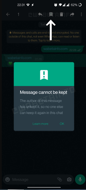 وأوضح تقرير "WABetaInfo"، أن واتساب سيصدر تنبيها عندما يتعذر الاحتفاظ برسالة تختفي، ي هذه الحالة ، قام مؤلف الرسالة المختفية بإزالة الرسالة من الرسائل المحفوظة بحيث لا يمكن لأي شخص آخر في المحادثة الاحتفاظ بها مرة أخرى، إذ يعد هذا التنبيه طريقة للتأكد من أن الأشخاص الذين يريدون إزالة رسائلهم الخاصة يمكنهم القيام بذلك دون عوائق.
