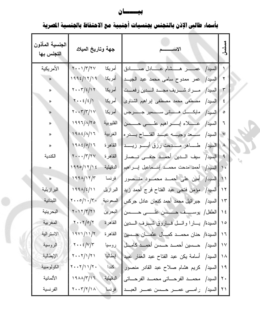 وجاء قرار وزارة الداخلية، بعد الاطلاع على الدستور وعلى القانون رقم 26 لسنة 1975 الصادر بشأن الجنسية المصرية، وعلى القرار الوزاري رقم 1004 لسنة 2018 الصادر بتفويض مساعد الوزير لقطاع شئون مكتب الوزير في مباشرة الاختصاصات المقررة لوزير الداخلية بموجب القانون رقم 26 لسنة 1975 بشأن الجنسية المصرية.